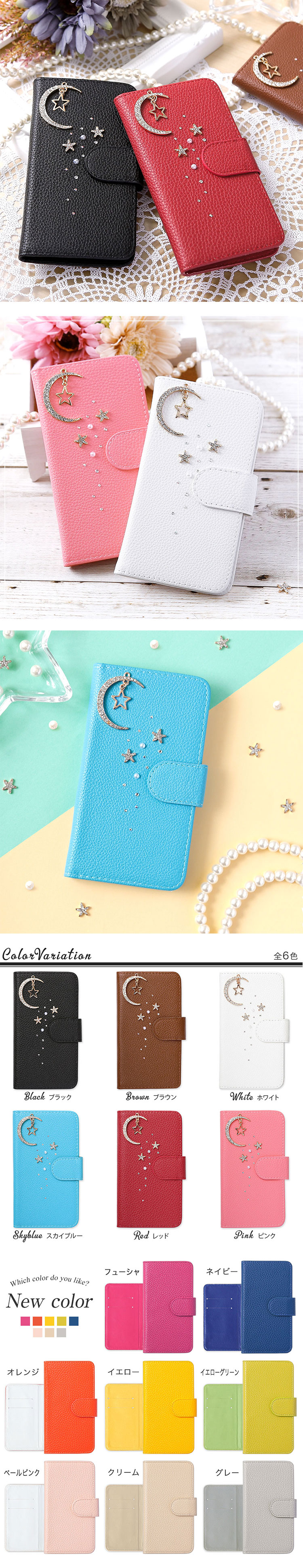 月&星のモチーフとパール、ラインストーンを散りばめた、かわいすぎない上品なデザインの手帳型スマホケース。