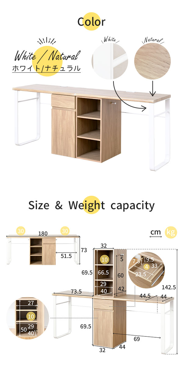 ◆作業面(収納部上下・デスク1台あたり):幅73.5×奥行44×床からの高さ73(約cm)