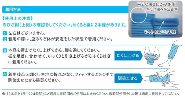 | ご使用方法 | 1.左右はございません。 2.着用の際は、座るなど体が安定した状態で着用ください。 3.本品を裾までたくし上げてから、脚を通してください。裾を足首に合わせて、ゆっくりと引き上げながらふくらはぎに着用ください。 4.着用後凸凹部分、生地に折れがなく、フィットするように手で馴染ませながら確認ください。 |