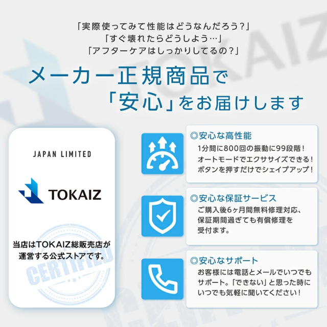 | 保証期間 | 6ヶ月間(振動マシン本体のみ) (フリーダイヤル電話サポート窓口あり) |
