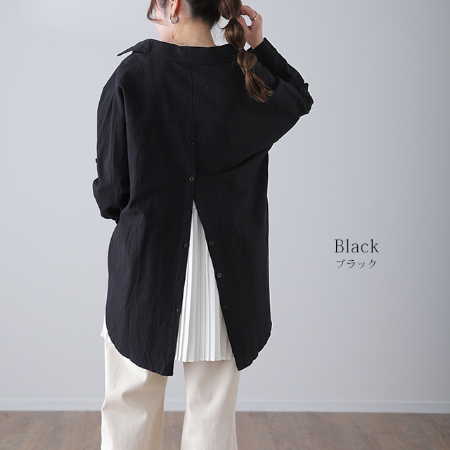 バックデザインにはボタンをあしらい、オープンにすることでまた違うニュアンスを楽しめ、デザインにも品質にもこだわりぬく大人のためのシャツです。