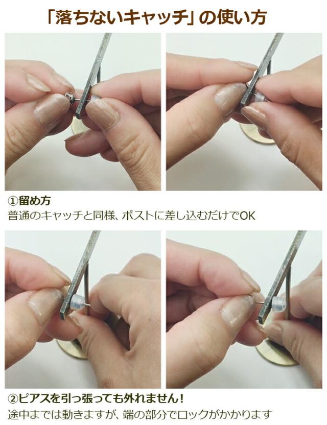 | ●ピアスの脱着のテストをしてから、実際に装着してください。 ●ポストの溝が浅いものや、無いものには適していません。 ●入浴やスポーツ時にははずされることをおすすめします。 ●ピアスの紛失に関しては保証できません。 ●時々、歯間ブラシ等でキャッチの穴の中を掃除してください(ほこり・垢等がたまるとロック機能がゆるくなる恐れがあります) ●シリコン部分に爪を立てないでください。シリコンをつまむときは指の腹を使って軽くつまんでください。 |