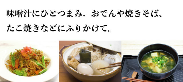 ご飯や味噌汁、おでん、たこ焼き、焼きそばに。