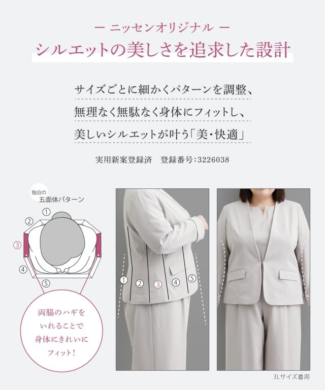 品質=【ジャケット】表地:ポリエステル100% 裏地:ポリエステル100% 【ブラウス、パンツ】ポリエステル100% [裏地]ジャケット:有(背抜き)ブラウス・パンツ:無 ジャケット:肩パッド有 前ホック開き 袖口スリット ポケット前2・内 ブラウス:後衿ぐりボタン開 パンツ:前ファスナー内ボタン開き ウエスト後ゴム入 ポケット両脇・後飾りポケット 共布リボン付 使用可能ベルト幅 約4cm この商品はジャケット・ブラウス・パンツの3点同サイズのみで販売します。 共布リボンは取り外しできます。LL〜5Lサイ