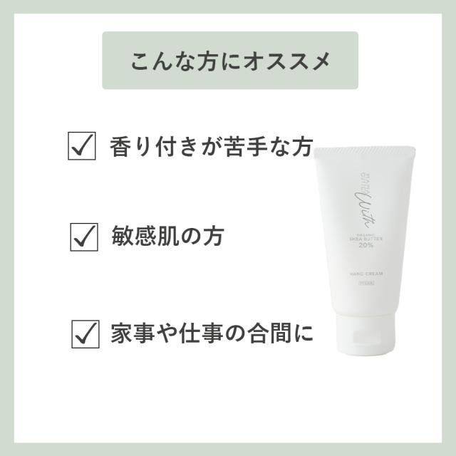 ●オーガニックシアバター*20%配合 乾燥した手肌に、濃厚な潤いを。 オーガニックシアバター*20%と高配合だから、シアの潤いが角質層まで浸透し、カサつく手肌をしっとりなめらかに。 爪や爪周りなど、乾燥が気になるところの保湿ケアにもおすすめです。 *シア脂(天然由来保湿成分) ●仕事中や家事の合間にも しっとり、なのにべたつかない仕上がり ベタつかず、さらりとした使い心地で、忙しい日々でもサっと保湿ケアが可能。 家事の合間やお仕事中でも、ベタつきを気にせずに心地よくお使いいただけます。 ●天然由来成分98%。 自然の力で優しく、潤う肌へ 毎日肌に触れるものだからこそナチュラルに。天然由来成分98%のシンプルな処方で、肌に負担をかけず、しっかりと保湿します。 自然のもつ力で、敏感なお肌もやさしく包み込む、ピュアなスキンケアタイムを。