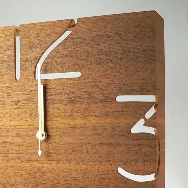 文字板の数字は丁寧に糸のこでくり抜いて作られています。側面に回り込み、くり抜かれた数字からは向こう側が見えるため、壁次第で雰囲気が変わります。見る角度によって影の出方も違って見え、シンプルなのにインパクトがあるデザインになっています。
