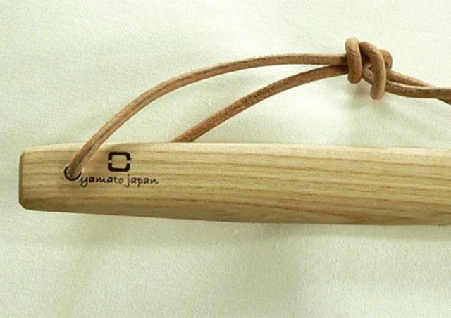 持ち手部分にyamato japanのワンポイントロゴが入っています。つるすための糸も革ひもを使用しているので使うごとに味わい豊かになります。