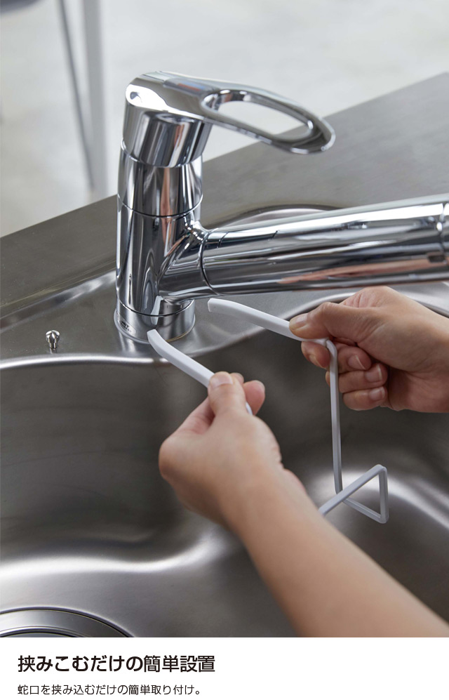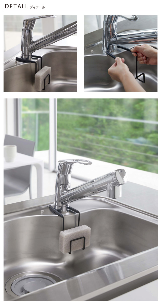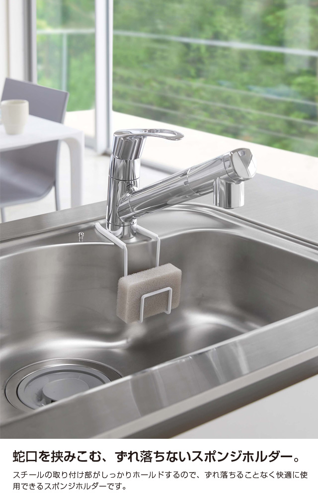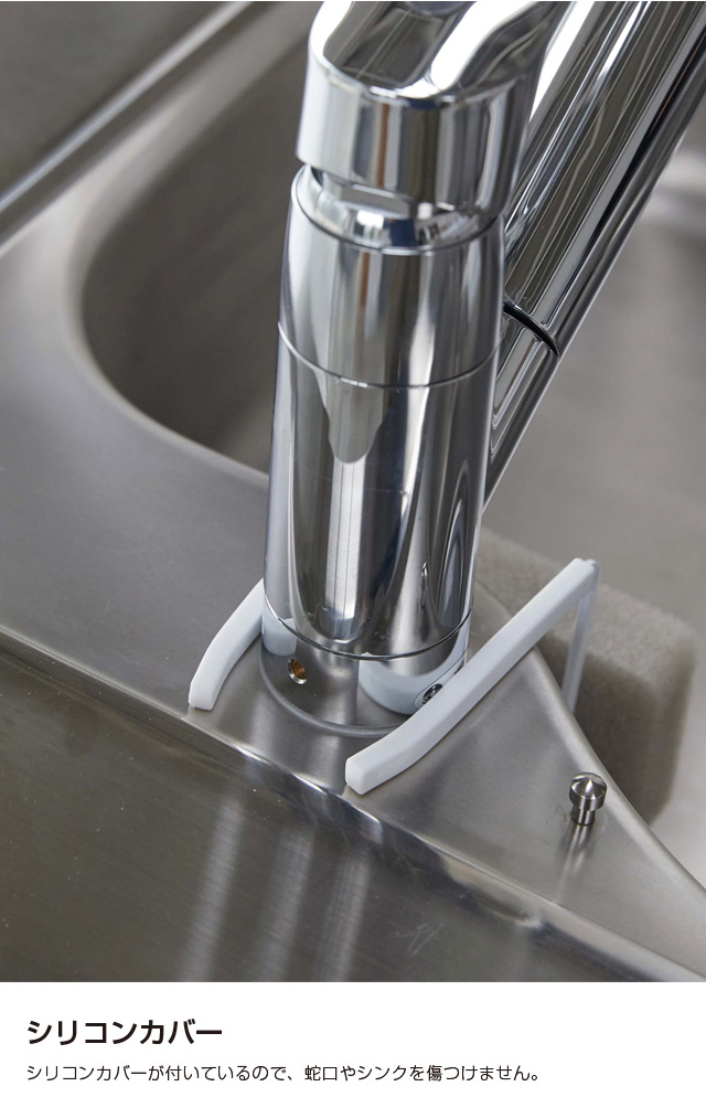 スチールの取り付け部がしっかりホールドするので、ずれ落ちることなく快適に使用できるスポンジホルダーです。 シリコンカバーが付いているので、蛇口やシンクを傷つけることがありません。