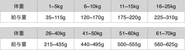 給与量を目安に、愛犬の大きさ、健康状態、年齢、運動量などを考慮して与えてください。製品情報