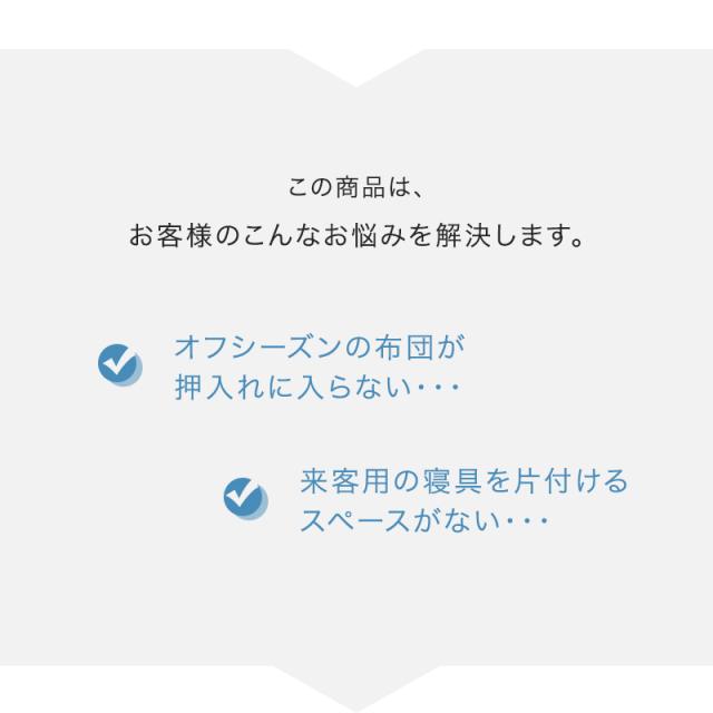 - 年1しか泊まらない両親の布団が邪魔で…押し入れもあまりないのでいつも出しっぱだった分厚い敷き布団二枚…しかも重い。二枚購入して部屋の隅へ。助かりました。また購入します。