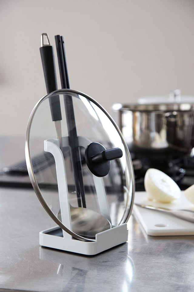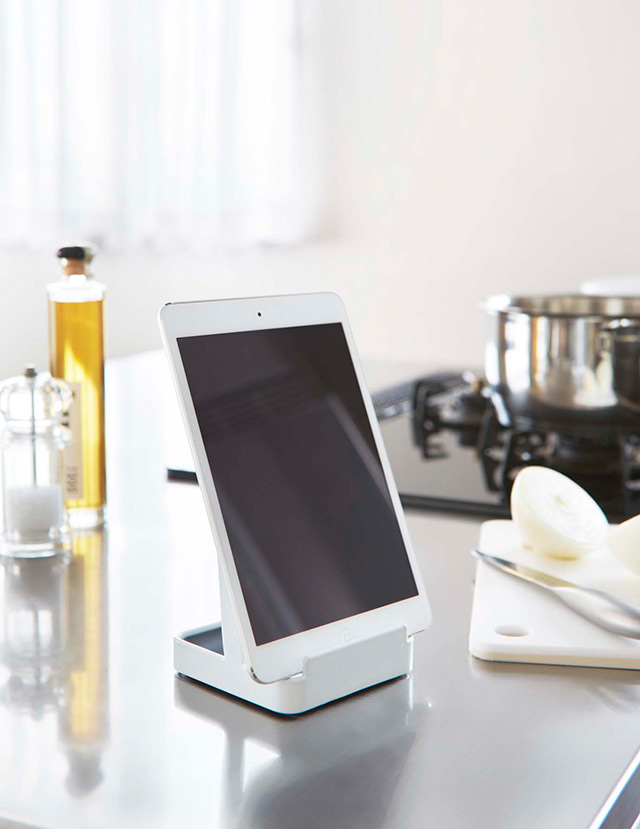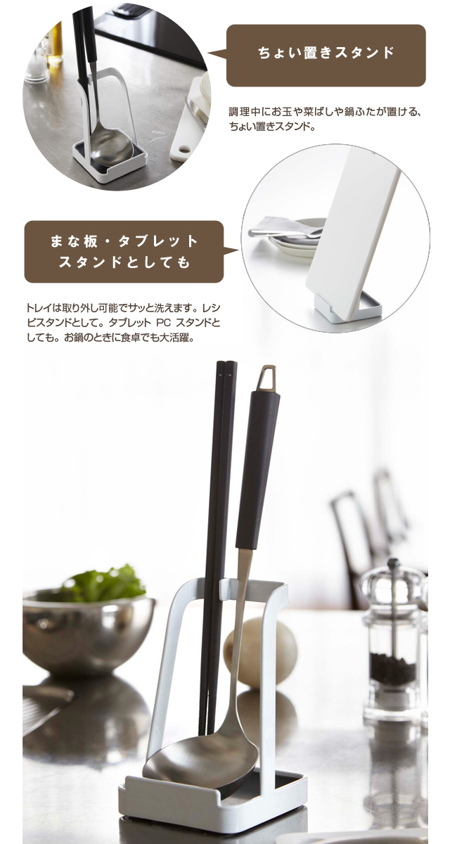 調理中にお玉や菜ばしや鍋ふたが置け る、ちょい置きスタンド。調理中のちょい置きに便利。お玉以外の小物(菜箸・ターナー・ヘラ・トング・しゃもじなど)や鍋蓋・フライパンカバーなどを立て ることができます。トレイは取り外し可能でサッと洗えます。レシピスタンドとして。タブレットPCスタンドとしても。お鍋のときに食卓でも大活躍。