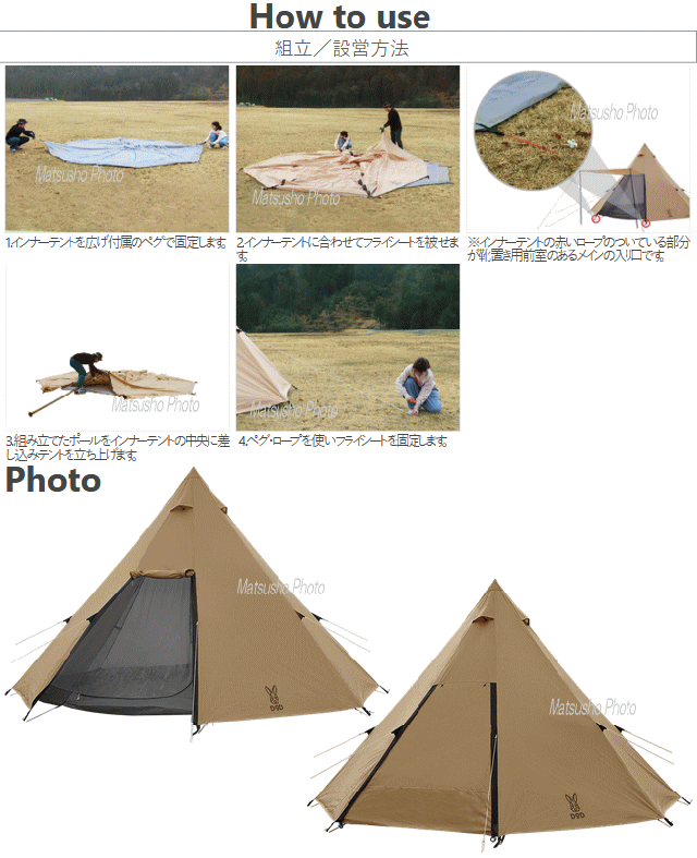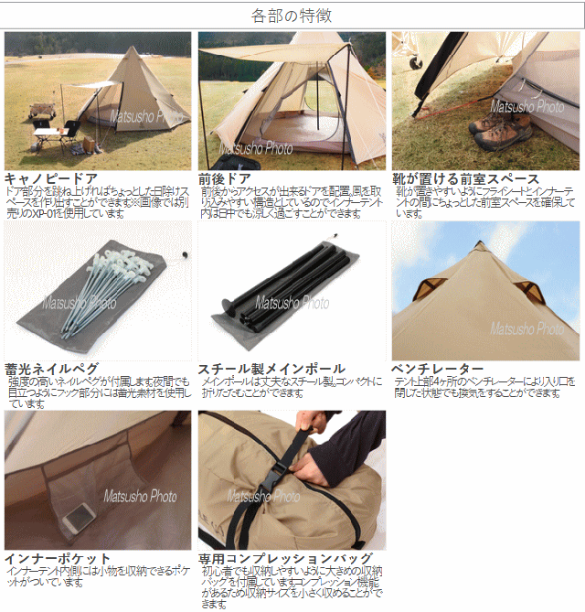 ペグを打ち込みポールを立ち上げれば完成するファミリーキャンプに適した簡単に設営できてコンパクトに収納できるシンプルな8人用ティピー型テント。大人でも立つ事ができる天井高300cmを確保。大人8人が寝られる広さです。ドーム型テントの様にフレームがなく1本のポールで建てられるため収納サイズはコンパクトになります。インナーテントは全面メッシュ仕様で高い通気性を確保しています。■カラー:タン■組立サイズ(外寸)約W460×D460×H300cm■インナーサイズ約W410×D360×H300cm■収納サイズ約W62×D25×H25cm■重量約12kg(付属品含)■収容可能人数大人8名■材質[フライシート]150Dポリエステル(PUコーティング)[フロア]150Dポリエステル(PUコーティング)[メインポール]スチール■最低耐水圧[フライシート]2000mm[フロア]5000mm■付属品:キャリーバッグ、ペグ×20本、ロープ×8本(テントに取付済)※2020年2月当社出荷分よりタープ連結による破損を防ぐ為にフライシート天頂部のループをなくしました。予めご了承下さい。