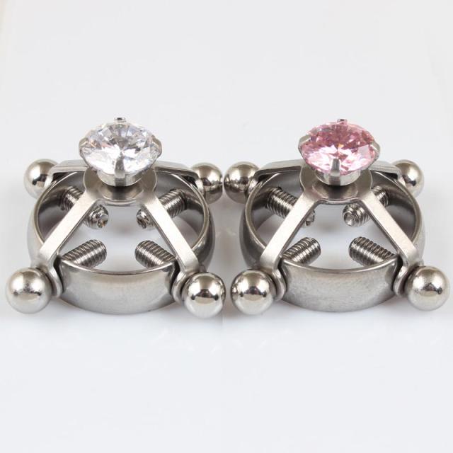 トップに大きなクリスタルとピンクのジルコニアをセットしたリングにネジを四つセットした乳首を挟むノンホールタイプのニップルクランプ。