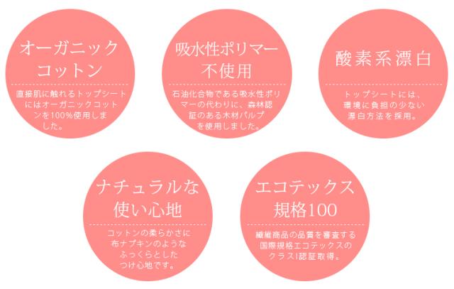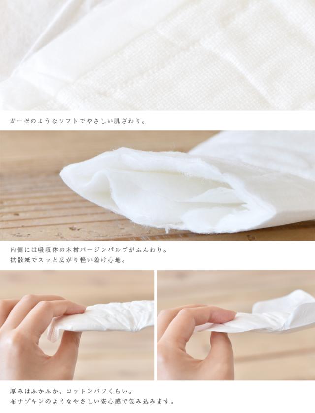 | デリケートな時期に直接肌に触れるものは、自然でやさしいものであってほしい。 布ナプキンを使いたいけれど、手間を考えるとなかなか……。 以前から多かった、「オーガニックコットンの生理用ナプキン」を求める声。 オーガニックコットンの専門ブランドから、素敵なパッケージでついに誕生しました。 肌に触れるのはオーガニックコットンのやさしい柔らかさ。 吸収剤など内部に至るまで、徹底した自然原料と安全性にこだわっています。 不織布から最終製品に至るまでも安心の日本製です。 吸収力やカバー力にも妥協なく、心地よいコットンが守ってくれる、 やさしい安心感のあるオーガニックコットンの自然派生理用ナプキンです。 | ||