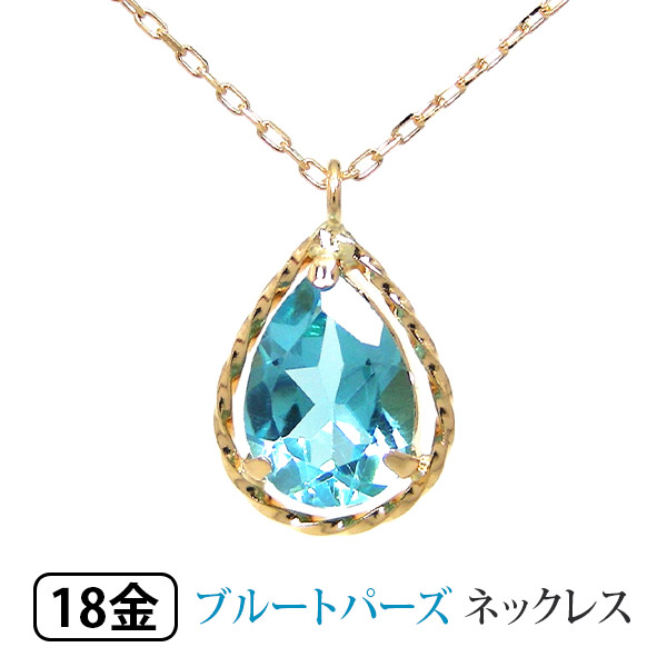 しとやかなドロップに、心惹かれる。ドロップ・ブルートパーズが放つ、たっぷりとした輝き。周囲をぐるっとヒネリを効かせた雫フレームで取り巻いたら、更に煌きとボリューム感がUP!こだわりの18金素材でありなが、お手頃価格で上手に存在感をプラスした秀逸デザインが魅力です。みずみずしいブルーカラーが、胸元に溢れるよう。年代を選ばない上品なデザインは、プレゼントにも最適です。