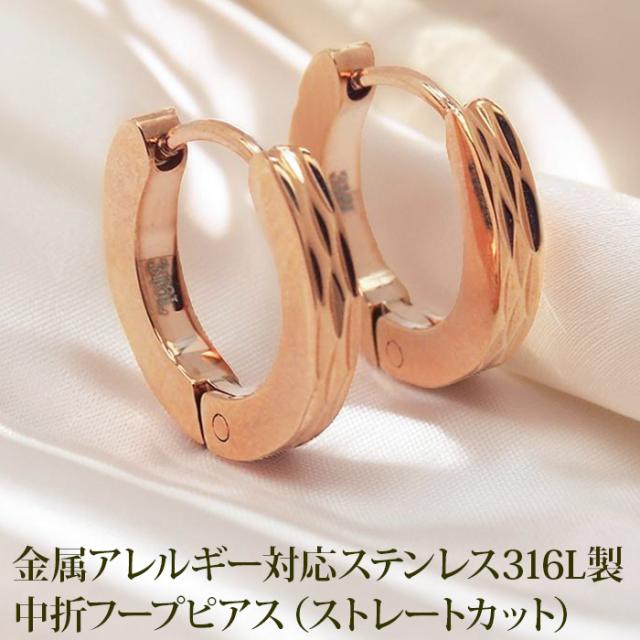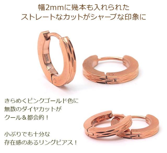 ピアス フープピアス つけっぱなし ダイヤカット ストレート ピンクゴールド PG 中折れ 2×13mm 金属アレルギー対応 ステンレス 小さめ ひっかからない 片耳 1個