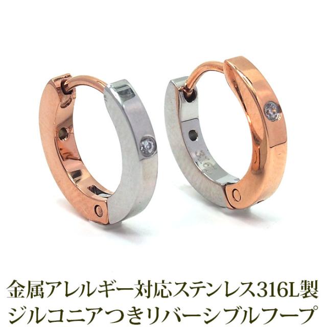 フープ わっか ピアス キュービック ステンレス 金属アレルギー対応 リバーシブル 3mm×13mm ピンクゴールド
