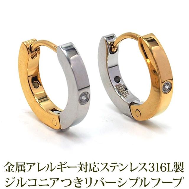 | フープピアス バイカラー キュービック付き リバーシブル 平打ち 中折れ 金属アレルギー対応 ステンレス |