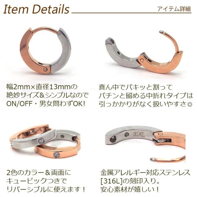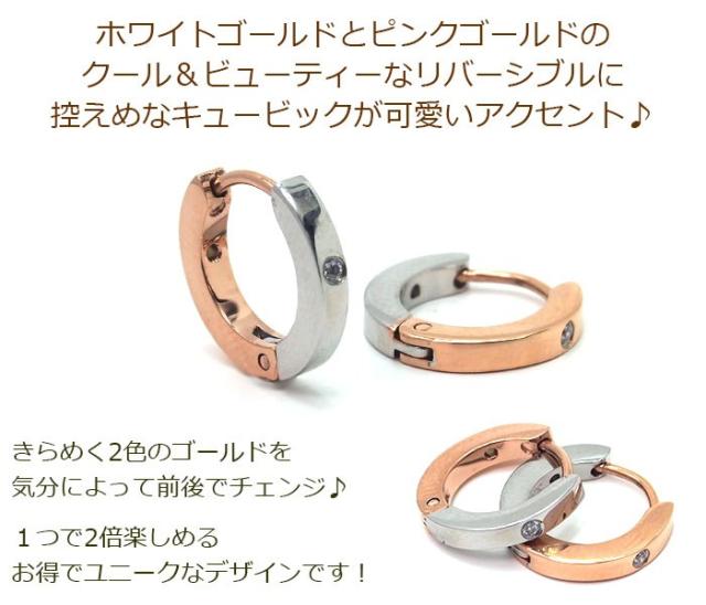 | 1つで2色のピアスとして使えるリバーシブルが楽しいフープピアス! 磨き上げられた艶やかな平面の美しさが際立つ平打ちタイプに、小さなキュービックがワンポイントでキラリと輝き、オシャレ感もぐっとUP↑ クールなホワイトゴールドと肌なじみが良くやわらかな印象のピンクゴールドの2色展開は、表裏ではっきり違いが出るので、レディースはもちろんメンズにも人気! 直径約13mm&幅3mmの大きすぎず、小さすぎずの絶妙サイズはON/OFF問わず、シンプルなので毎日使えるヘビロテアイテムに! 1つで2通りの着け方ができる、ユニークでお得なデザインです! |
