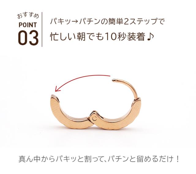 真ん中でパキッと割って、パチンと留めるだけの中折ピアスは、キャッチがないので見えない耳の後ろでキャッチをはめる煩わしさがありません♪