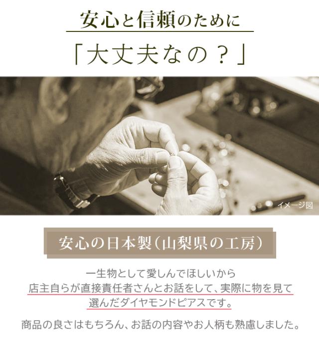 | じつは、店主自身がずっと憧れていて、欲しいと思っていた本物の「天然ダイヤモンド」。 でも価格もピンからキリまであり、傍目には違いもよくわかりません。 それでも一度は身につけたいダイヤモンドピアスを求めて、実際に足を運び、直接責任者さんからお話を聞いて、やっと納得のいく工房・ピアスにたどり着きました! ひとつずつ丁寧に大切に作られるピアス。 大きさはとても小さいけれど、その輝きは、耳元でしっかり存在感を発揮します! もちろん、ポスト・キャッチ・台座等、お肌に触れる部分はすべて金属アレルギー対応。 また不安を払しょくするため、第三者機関による鑑別もしていただき、1個に1枚、オリジナルナンバー入りの鑑別書をお付けします! さらに、当店でダイヤモンドピアスを扱う一番の決め手になったのが↓このキャッチに出会ったから↓ ![]() ▲ 落ちないピアスキャッチ(1個1,100円/別売り) 高価なダイヤモンドピアスを失くして悲しい思いをする前に、ぜひ安心もご一緒に♡ |