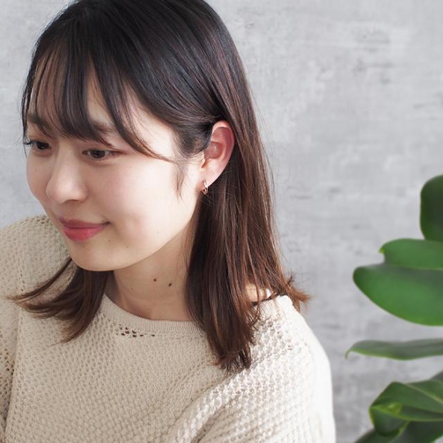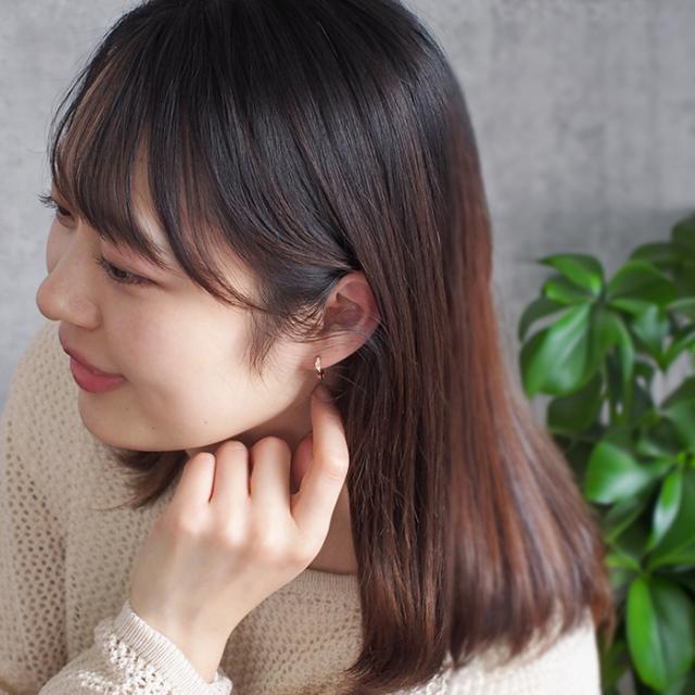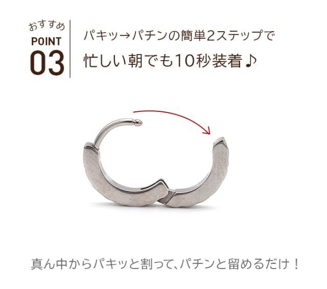 真ん中でパキッと割って、パチンと留めるだけの中折ピアスは、キャッチがないので見えない耳の後ろでキャッチをはめる煩わしさがありません♪
