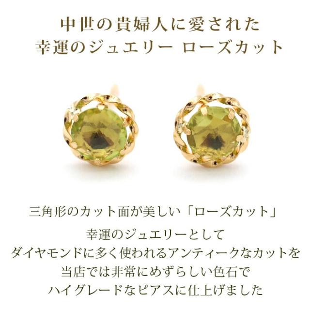 【幸運のジュエリー】ローズカット ピアス K18 18金 ペリドット ピアス 軸太0.65mm ポスト10mm 金属アレルギー対応 片耳 1個 贈り物 ご褒美 お守り