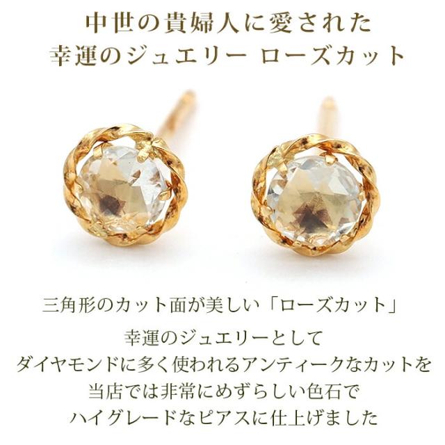 | 中世の貴婦人たちに愛された、三角形のカット面が美しい「ローズカット」。 幸運のジュエリーとしてダイヤモンドに多く使われるアンティークなカットを、当店では非常にめずらしい色石でハイグレードなピアスに仕上げました。 4mmのストーンのまわりを、クラシカルなデザインの台座が包み、ひとまわり大きく華やかな存在感です。 通常『アメジスト』といえば紫色のものを思い浮かべると思いますが、ブラジルのモンテズマ鉱山で産出されたアメジストを過熱加工していた際、偶然緑色に変化したものがグリーンアメジストの起源と言われています。 「グリーン」とついていても、透明度が高く、ほんのり薄いソーダーのような色なので、地金のイエローゴゴールドを透かして、角度によって色合いを変えるきらめきが印象的です。 そのみずみずしい透明感は、葉に落ちた小さなひとつぶの水滴のように、空間や心の疲れを浄化するやわらかな光に満ています。 きっとグリーンアメジストを身につければ、きっと穏やかな癒やしの時を感じることができるでしょう。 ぜひ一生物のお守りジュエリーとして、あなたのそばに— |