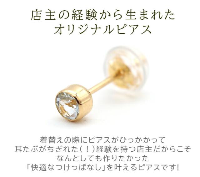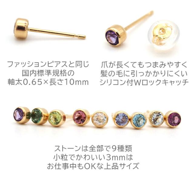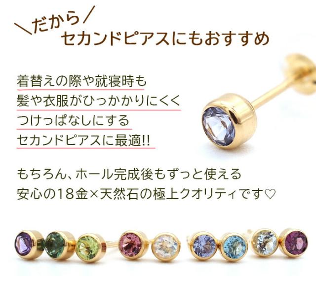ひっかからない新形状!セカンドピアス つけっぱなし 18K 18金 天然石 誕生石 3mm くるりんピアス ふせこみ フクリン 当店オリジナル 品質保証書つき 軸太0.65mm ポスト10mm 金属アレルギー対応 片耳 1個 日本製