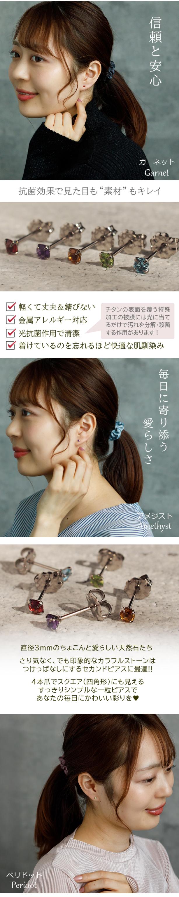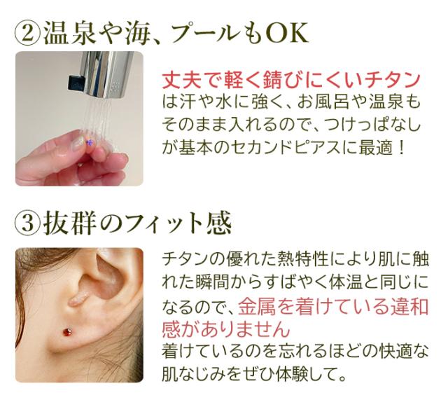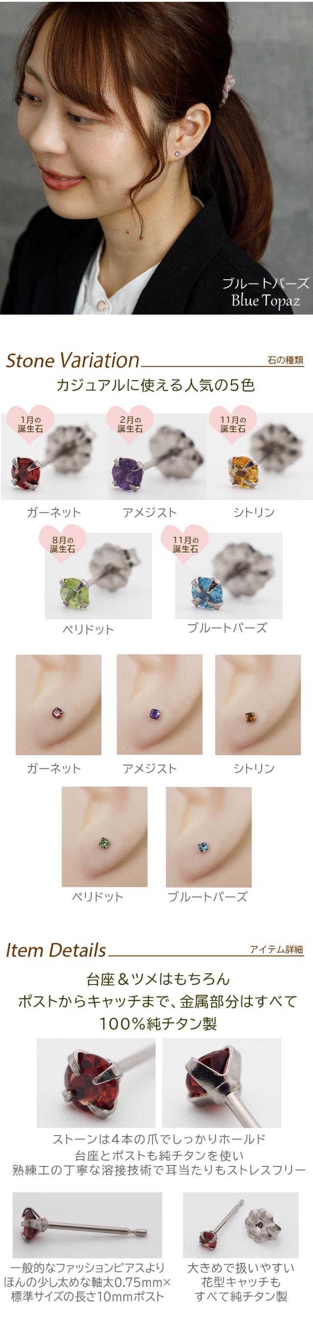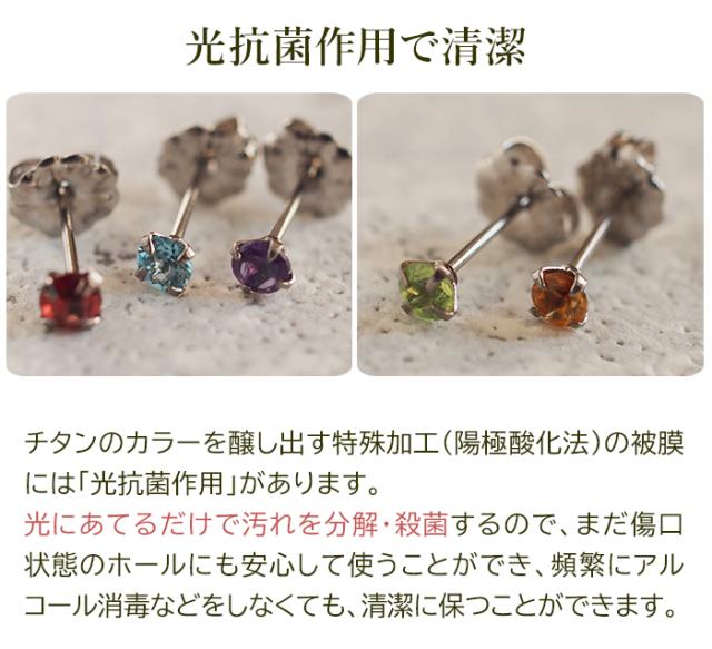 | 快適な着け心地でつけっぱなしにするセカンドピアスに最適なチタン×小粒で愛らしくキラキラ印象的な天然石の最強な組み合わせ。 一日の終りに水洗いしたら蛍光灯の下に置いておくだけでチタン独自の抗菌効果を発揮し清潔に保ちます! デイリーユースに最適な使いやすさ、ぜひお試しください。 |