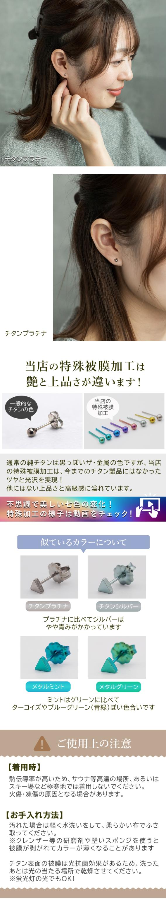 | あり 純チタン製 ※純チタンは被膜により表面が大変滑らかなため、ステンレス等に比べるとキャッチがゆるめになります。 セカンドピアスとしてつけっぱなしにされる方や心配な方は、別売りの「落ちないキャッチ」をご利用ください。 |
