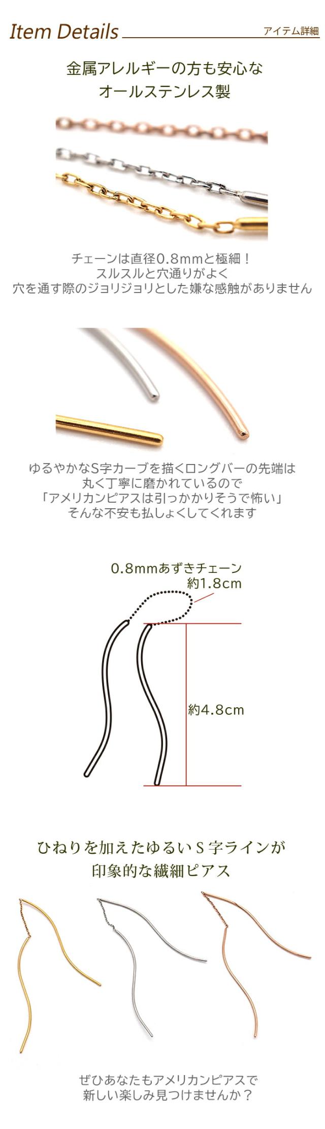 | オール金属アレルギー対応ステンレス316L製 アメリカンピアス 0.8mmあずきチェーン(S字タイプ) |