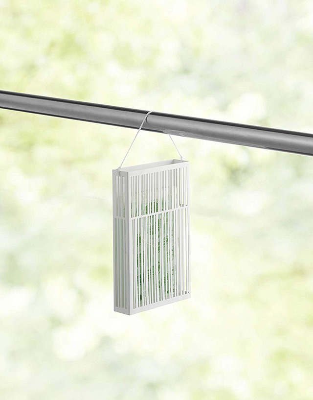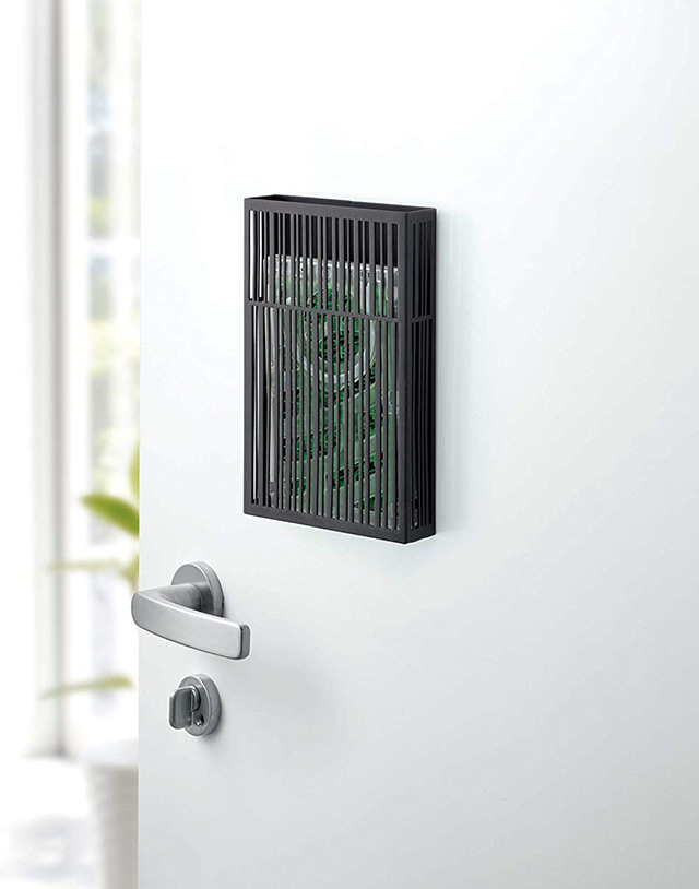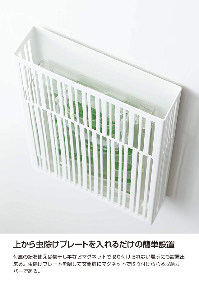 上から虫除けプレートを入れるだけの簡単設置。付属の紐を使えば物干し竿などマグネットで取り付けられない場所にも設置出来る。虫除けプレートを隠して玄関扉にマグネットで取り付けられる収納カバーである。