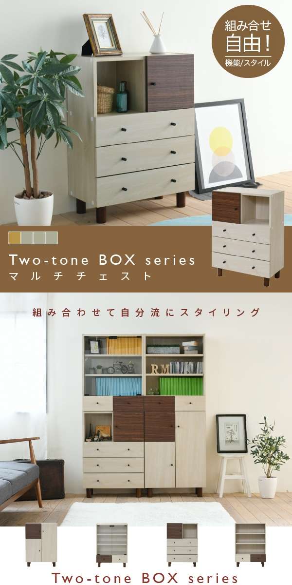 木目のあるナチュラル×ダークブラウンのツートーンで、ちょっぴりレトロな大人可愛いマルチチェスト。3段の引き出しには小物や雑貨を収納したり、ハンカチなどの衣類を収納しても◎引き出しの上部にはオープン、扉付きの収納もご用意。「見せる収納」「隠す収納」どちらも使用できるデザインです。同じシリーズ商品と積み重ねたり横に並べたり、自分流のスタイリングが可能。自由に組み合わせることで、お部屋に合わせたレイアウトとオリジナル収納を実現できます。