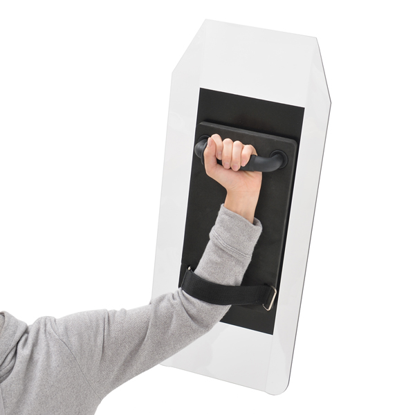 まるで両手が使えるイメージに近いかと思います。ポリカーボネートの内側には衝撃緩衝材が貼られているので、相手からの攻撃を盾に受けながら カウンター気味に突っ込んで、空いている片手での攻撃をも可能にします。