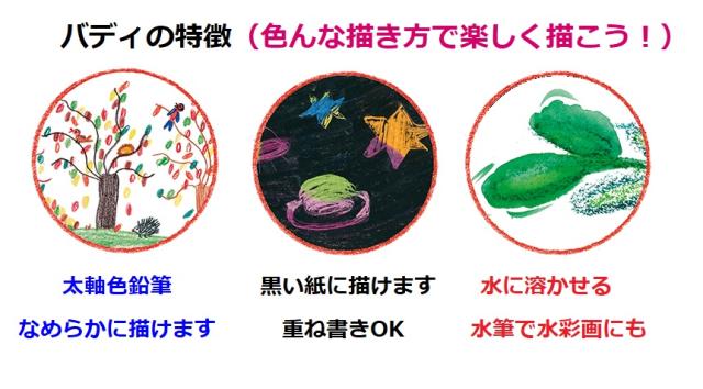太い軸で手の小さなお子様でも持ちやすく、3種類(色鉛筆・クレヨン・水彩色鉛筆)の使い方ができます。