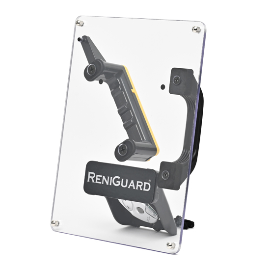 斜め前から見た写真。パネル表面には約1mm厚の透明で薄いポリカーボネート板が共締めされています。この1mm板と5mm板の間に広告や告知文を挟むとカウンターに置いても盾には見え辛くなります。コンビニなどでは隣のレジをご使用ください等の案内でこの盾をよく見かけます。