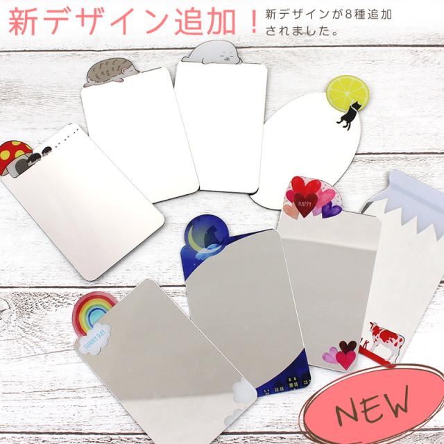 | 商品説明 | カードポケットにすっぽり収まる!歪みもなく、きれいに映るカード型ミラーです。 コンパクトミラーや手鏡などを持ち歩く必要なし!薄くて、軽い!収納場所にも困らない鏡です。 スマホケースのカードポケットやお財布、パスケースなどに収納可能なカード型タイプだから、身だしなみチェックもさっと取り出してすぐにチェックできます。 落としたり、曲げたりしても割れにくく、曲げてしまっても元にもどる特殊加工がされています。 ポケットから取り出しやすいイラスト付きとスマホケースなどの窓付きカードポケットがミラーに早変わりするノーマルver.があります。 スマホケースのポケットに、お財布やカードケースに!! |