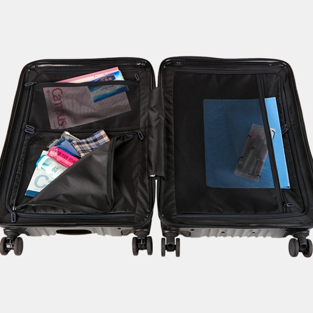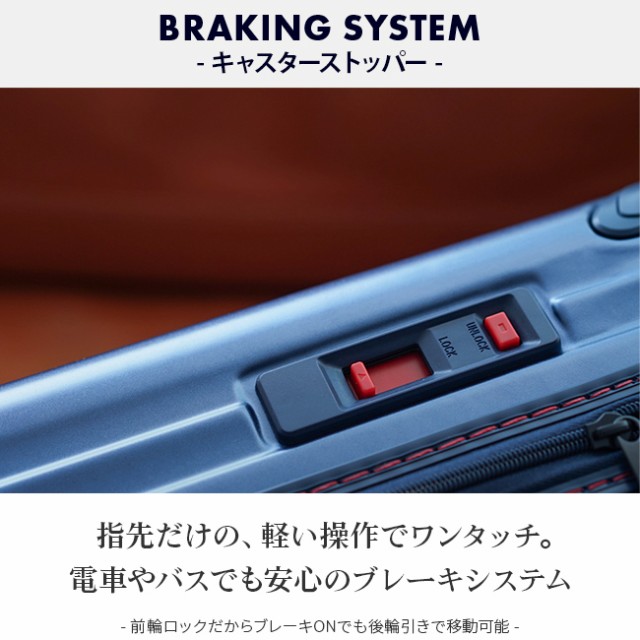| □ BRAKING SYSTEM ワンタッチでキャスターのブレーキがオン・オフ可能な、軽い操作感のスライドスイッチ・リリースボタンを装備しています。電車やバスなどでのストレスを軽減します。 □ SILENT DOUBLE CASTER 耐久性にも定評のあるHINOMOTO製の双輪キャスターに消音タイヤを組み合わせることで、より静かで滑らかな安定感のある走行が可能です。 □ BOTTOM HANDLE 車両の棚、空港のターンテーブルなどでスムーズに安全にスーツケースを上げ下げできるよう、ボディの下部にもハンドルを装備しています。 □ TSA DIAL LOCK メインファスナーとフロントファスナーをまとめて施錠・解錠することができます。開閉はそれぞれ単独で操作可能です。カギの持ち運びが不要なため、紛失の心配もありません。 □ ROUND ZIPPER DIVIDER ラウンドジッパー式の中仕切り、クロスベルトで荷物をしっかりホールドできます。 |