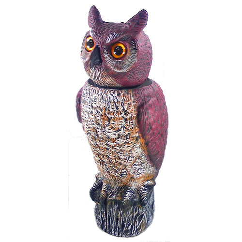 | 小型の鳥類を食べる性質のあるフクロウで、小型の鳥類を傷付けることなく撃退できます。 夜行性のフクロウなので、昼間だけでなく、夜にも効果があります。 また、フクロウは、苦労をしない「不苦労(ふくろう)」や福がこもる「福籠(ふくろう)」、学問の象徴の「森の哲学者」など、 実にさまざまな呼び名があり、様々な場所で「幸せをよぶ鳥」と、うたわれています。 |