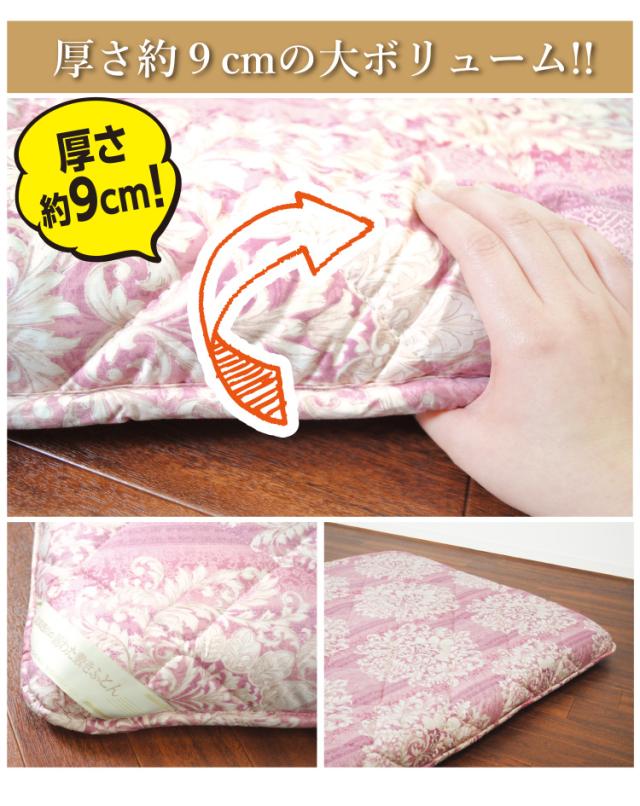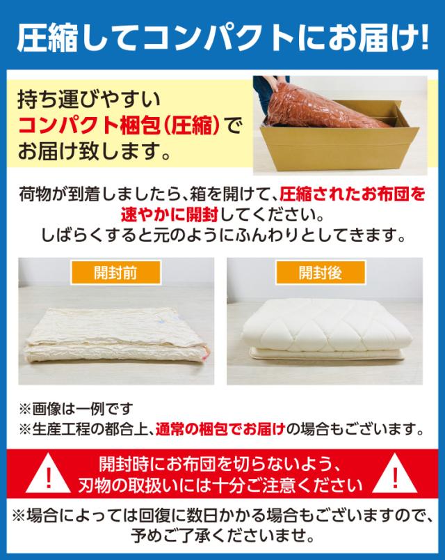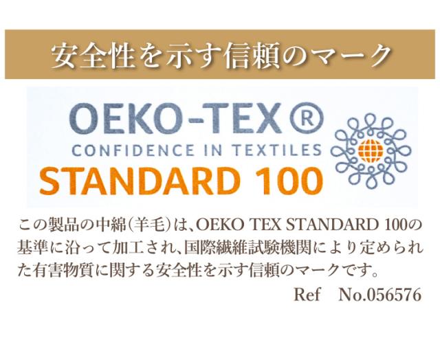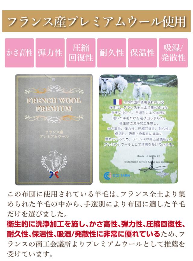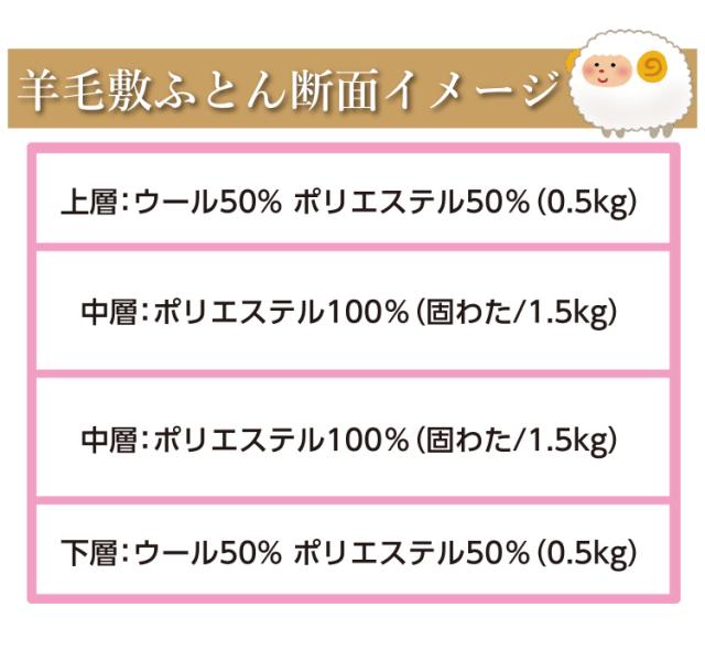 | 組 成 | 【ふとんがわ】 表地・裏地:綿100% 【詰め物】 上層:毛(ウール) 50% ポリエステル 50%(0.5kg) 中層:ポリエステル 100%(固わた)(1.5kg) 中層:ポリエステル 100%(固わた)(1.5kg) 下層:毛(ウール) 50% ポリエステル 50%(0.5kg) |