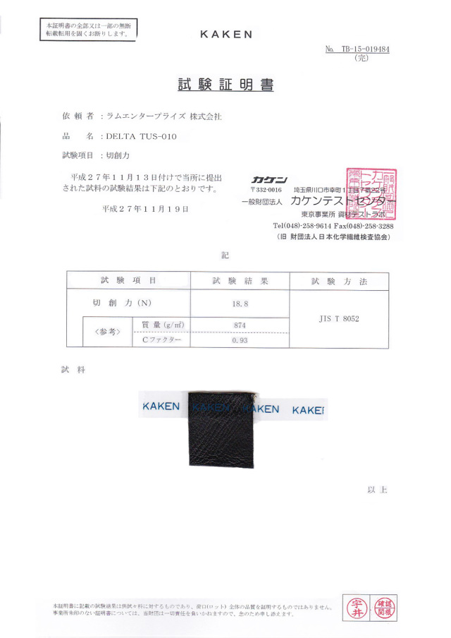 切創力 :18.8N (JIS T 8052) 日本化学繊維検査協会
