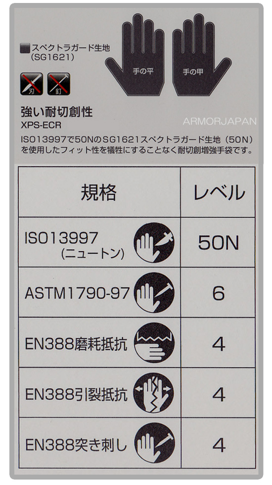 耐切創抵抗: スペクトラガードを使用した手袋の中でも、この生地の耐切創性能は カケンで41N、ISO19337では50Nとクラス最高のレベルを有します。