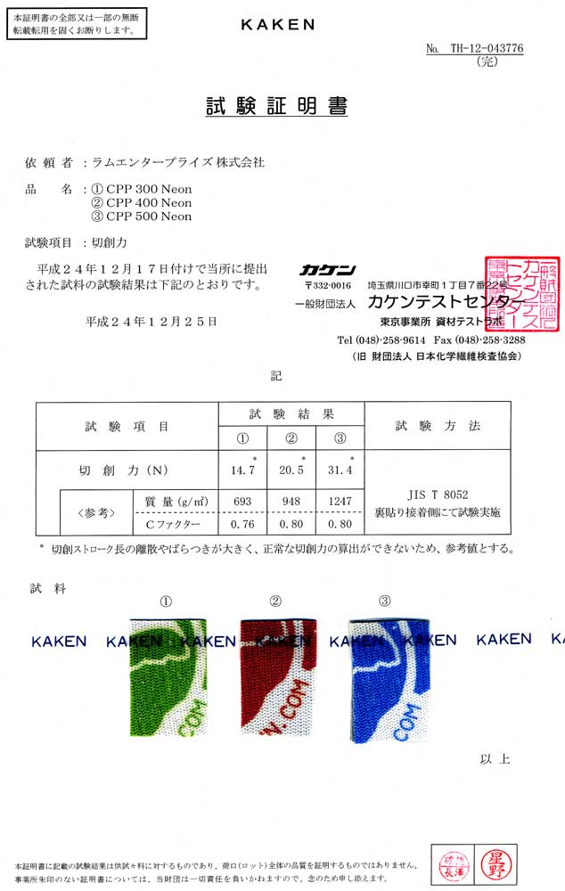 切創力 :20.5N (JIS T 8052) カケンテストセンター