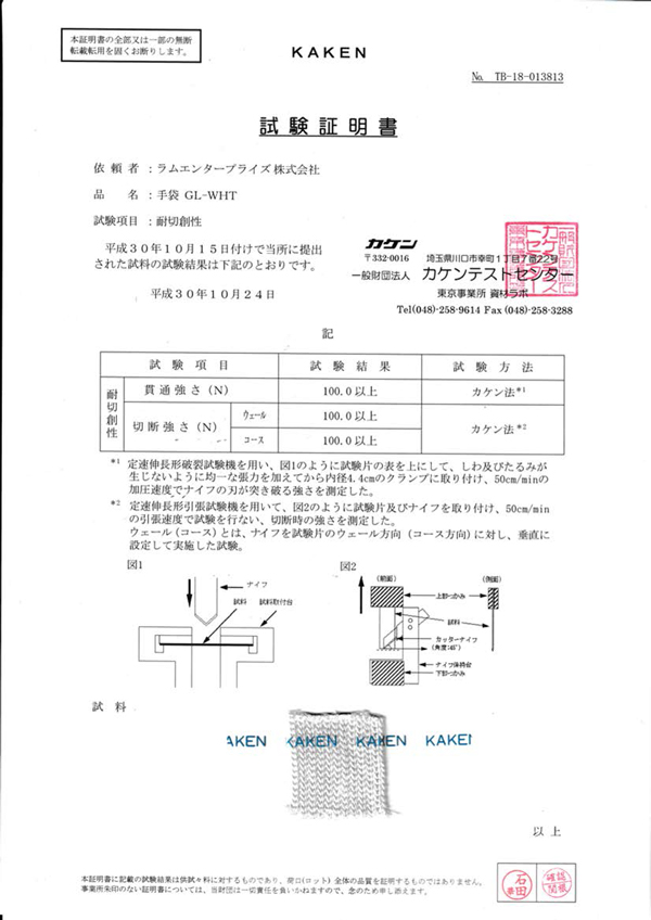 防刃グローブでは世界一の切創耐性があります。 カケンテストセンターでは撚糸にワイヤーを使用したグローブのJIS-T-8052のテストは受付を止めています。 これはワイヤーが導通することで試験結果にムラが発生することが主な理由となっています。 そこでカケン法による貫通強さと切断強さの試験を行いました。この試験方法では100Nまで計測できるのですが、 今回の試験結果はウェールもコースも100Nの値を超える驚異のテスト結果が得られました。