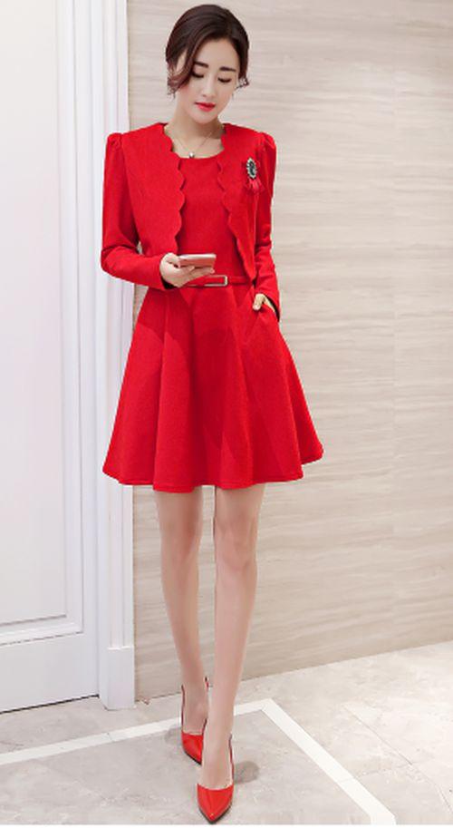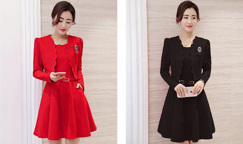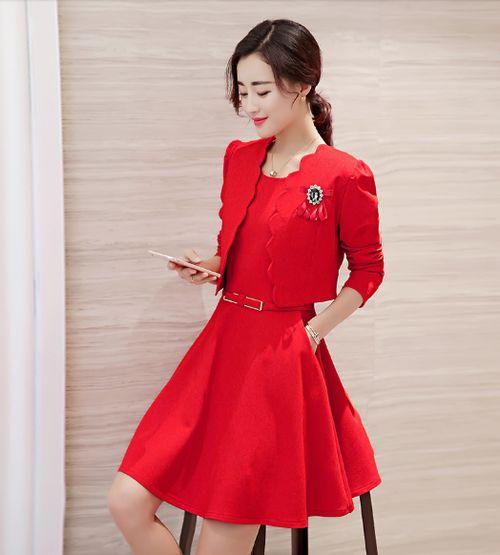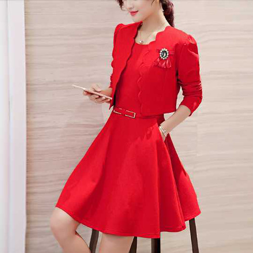 ジャケットとフィット&フレアワンピースの2点セット。