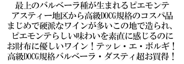 最上のバルベーラ種が生まれるピエモンテアスティ—地区から高級DOCG規格のコスパ品まじめで硬派なワインが多いこの地で造られ、ピエモンテらしい味わいを素直に感じるのにお財布に優しいワイン!テッレ・エ・ボルギ!高級DOCG規格バルベーラ・ダスティ超お買得!
