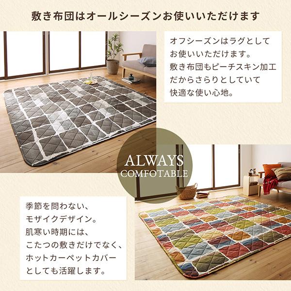 敷き布団は春夏はラグとして秋はホットカーペットカバーとして、もちろん冬はコタツの敷き布団としてオールシーズン使え、さらに底冷え対策、そして快適なリビング空間を約束してくれるラグタイプ敷き布団を採用。