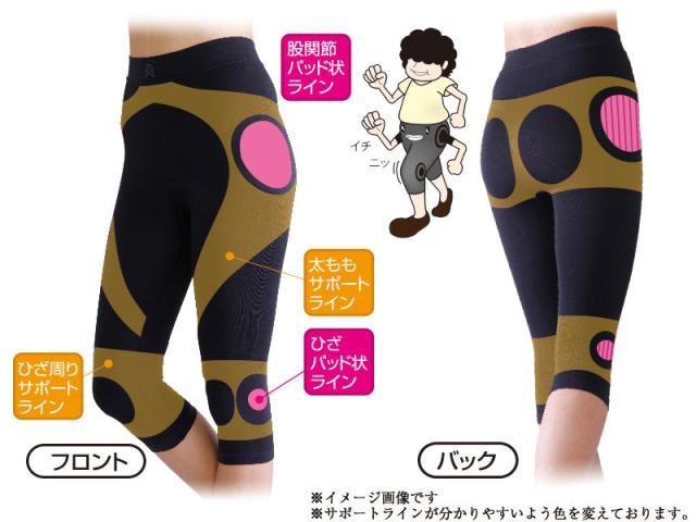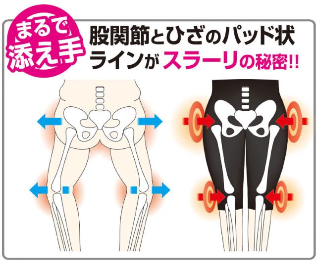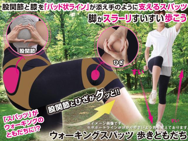 股関節と膝を「パッド状ライン」が添え手のように支えるスパッツ。脚がスラーリすいすい歩こう!年と共に股関節やひざは弱くなり、どうしても外向きにくせがついてしまいます。こんな方に歩きともだち。ひざと股関節にパッド状の着圧ラインを配置、脚が外側に向くことを押さえ、歩きやすいまっすぐ脚を目指します。また太ももに斜めのテーピングラインを入れているので、自然と一歩がまっすぐにでやすくしています。