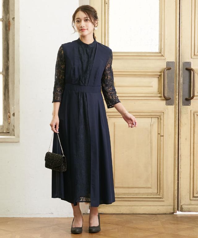 [keyword] レディース ファッション 女性 大きいサイズ ぽっちゃり ふくよか プラスサイズ ラージ 標準サイズ 普通サイズ ゆったりサイズ 七分袖 3/4スリーブ おしゃれ フレア フレアスカート Aライン 無地 無地調 柄 かわいい 春 [comment] フロントレース使いが上品な大人の雰囲気を演出してくれるワンピースドレス♪LL〜8Lの大きいサイズを揃えました♪★こだわりポイントフロントレース使いが上品な大人の雰囲気を演出してくれるワンピースドレス♪繊細なレースを使用♪中心ラインにレースを使用することで、スッキリした印象に!スタンドカラー・ウエスト切替デザインが、スタイリッシュな着こなし♪黒×ベージュの配色がモードな雰囲気を演出してくれる黒系と、落ち着いた印象のネイビーの2色展開!結婚式・二次会などの華やかなシーンはもちろん、お呼ばれ・食事会など、セミフォーマルシーンでも大活躍♪★体型カバーポイント上品なレースで、気になる二の腕をおしゃれにカバー♪膝見えをカバーしてくれる安心丈♪ウエスト後ろゴム入りで、着脱楽チン!★おすすめ着用シーン【結婚式】【二次会】【謝恩会】【お食事会】【お呼ばれ】【セミフォーマル】など幅広いシーンで着用頂けます。※注意